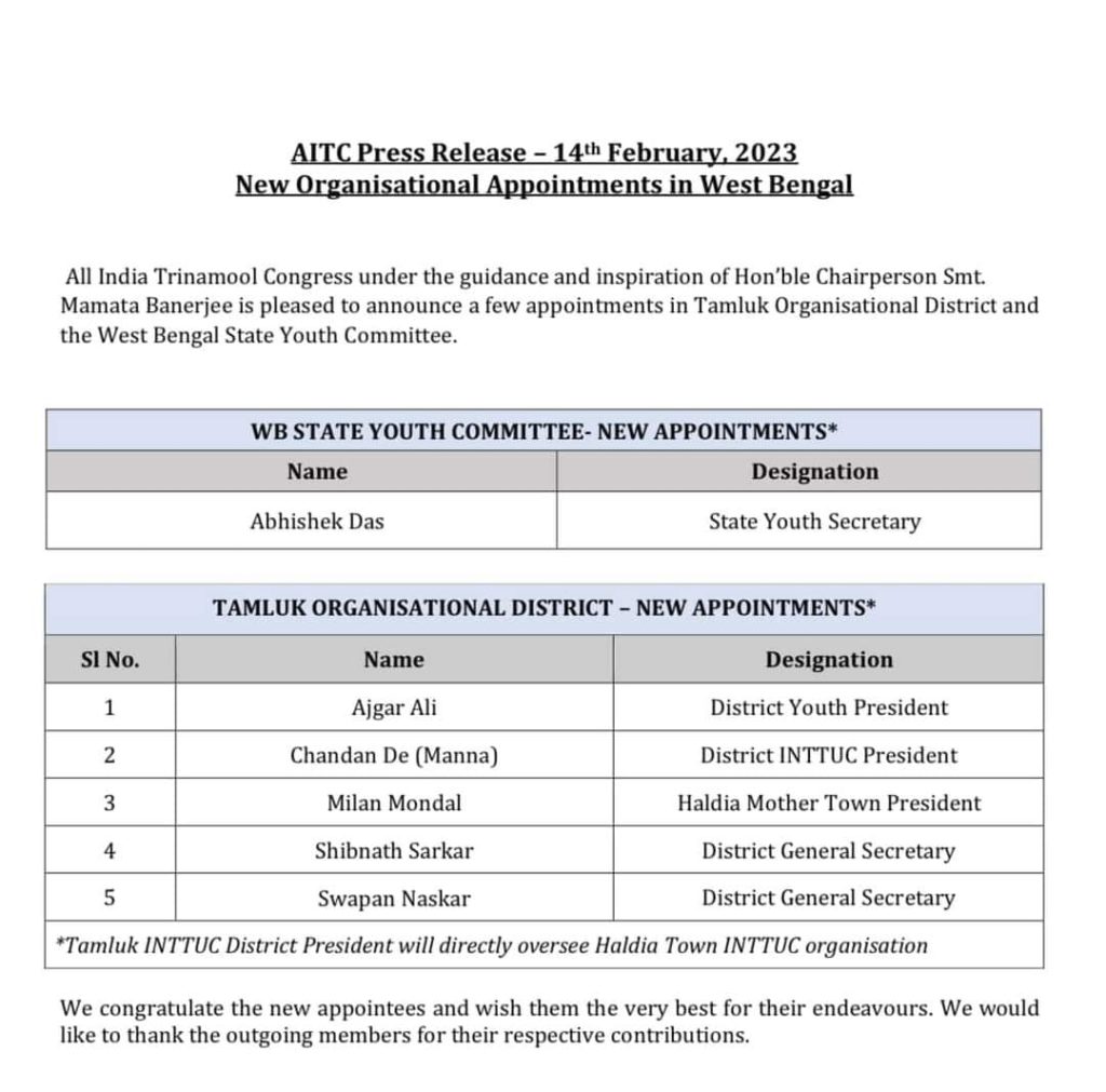 তমলুক সাংগঠনিক জেলা যুব তৃণমূল কংগ্রেসের সভাপতি অভিষেক দাস থেকে প্রমোশন পেয়ে যুব তৃণমূল কংগ্রেসের রাজ্য সাধারণ সম্পাদক হলেন । পূর্ব মেদিনীপুর জেলা তৃণমূল যুব কংগ্রেসের সভাপতি হলেন আজগর আলি (পল্টু)।