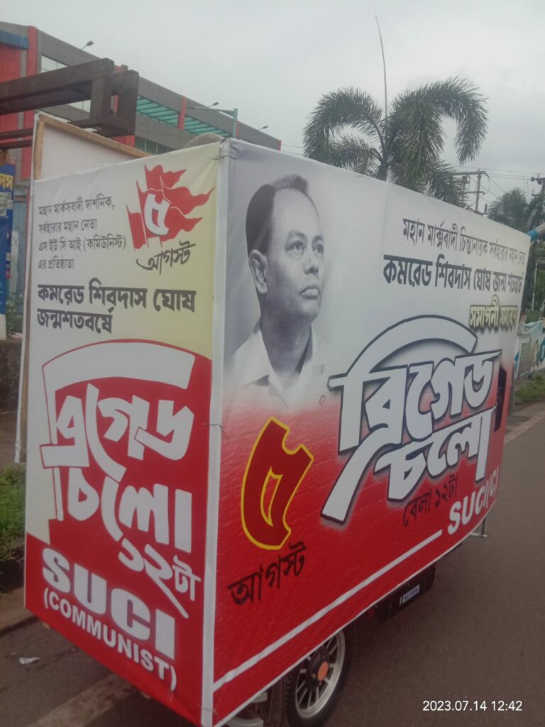 আগামী ৫ আগষ্ট ভারতবর্ষের আপোষহীন ধারার বিপ্লবী, স্বাধীনতা সংগ্রামী ও এস ইউ সি দলের প্রতিষ্ঠাতা শিবদাস ঘোষের জন্মশতবর্ষের সমাপ্তি দিবস উপলক্ষে ব্রিগেডে লাখো মানুষের এক মহতী সমাবেশ অনুষ্ঠিত হতে চলেছে। সমাবেশে প্রধান বক্তা হিসেবে উপস্থিত থাকবেন,দলের সর্ব ভারতীয় সাধারণ সম্পাদক প্রভাস ঘোষ। এছাড়াও ২৬ টি বিভিন্ন রাজ্য থেকে দলের নেতা- কর্মীরাও উপস্থিত হবেন ওই সভায়।