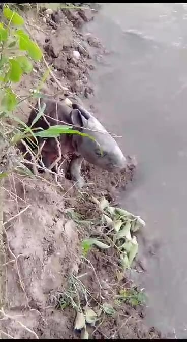 স্থানীয় লোকজনের চিৎকারে ছুটে আসে বন বিভাগের টহলরত কর্মীরা গন্ডার শাবকটিকে ভেসে যেতে দেখেই নিজেদের জীবনের পরোয়া না করেই খরস্রোতা নদী থেকে গণ্ডার শাবকটিকে উদ্ধারের কাজ শুরু করে। শেষমেষ বনদপ্তরের খুনিয়া স্কোয়াডের কর্মীদের তৎপরতায় গন্ডার শাবকটিকে অনেকটা দুরের নথুয়ার চর এলাকা থেকে উদ্ধার করতে সমর্থ হয় বন কর্মীরা।