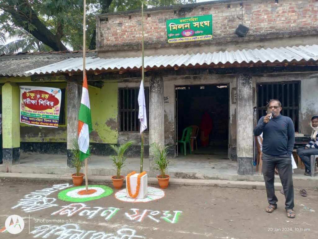 মিলন সংঘের প্রাক্তন সভাপতি মহাদেব মণ্ডল জাতীয় পতাকা এবং মিলন সংঘের বর্তমান সভাপতি ডাঃ দেবীরঞ্জন সনবিঘ্ন সংঘের পতাকা উত্তোলন করেন এবং জাতীয় সংগীত পরিবেশনের মধ্য দিয়ে অনুষ্ঠানের সূচনা হয়।
