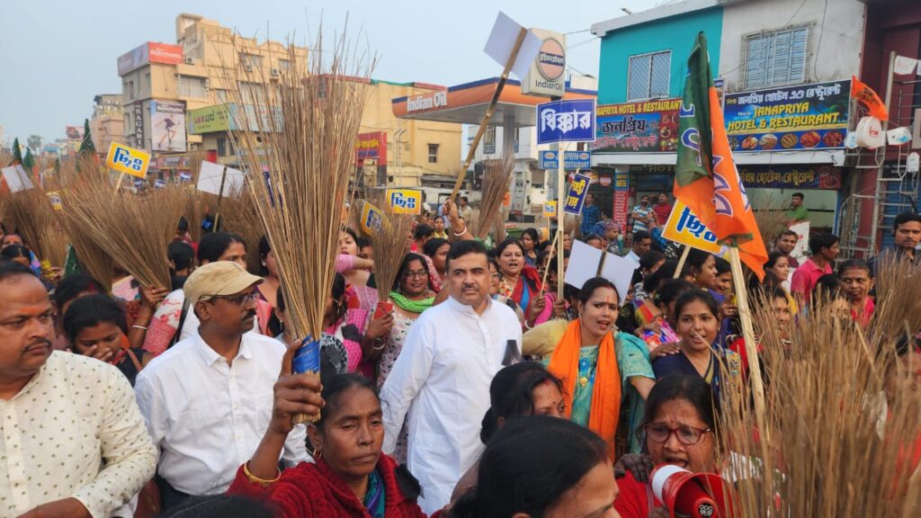 মহিলা পর্যটককে লাঞ্ছনার প্রতিবাদে এবং নরাধমদের দৃষ্টান্তমূলক শাস্তির দাবি নিয়ে দিঘায় ঝাঁটা হাতে মিছিল করলো বিজেপি।কর্মীদের সেই মিছিল ও থানা ঘেরাও কর্মসূচীতে পা মেলান রাজ্য বিধানসভার বিরোধী দলনেতা শুভেন্দু অধিকারী।