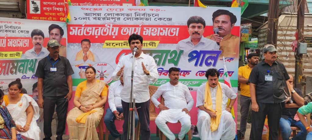 সর্বভারতীয় আর্য মহাসভার পক্ষ থেকে পথসভার আয়োজন করা হয়। সেই মোতাবেক মঙ্গলবার সন্ধ্যায় বহরমপুর রানীবাগানে এই পথসভা অনুষ্ঠিত হলো। মুর্শিদাবাদ জেলা সভাপতি মুস্তাক রশিদের নির্দেশে বহরমপুর লোকসভার সর্বভারতীয় আর্য মহাসভার প্রার্থী সোমনাথ পালের সমর্থনে এই পথ সভা করা হয়। এদিন পথ চলতি মানুষের হাতে সর্বভারতীয় আর্য মহাসভা কি তাঁর লিফলেট বিতরণ করেন।