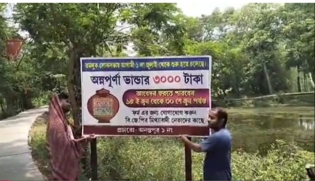 বিজেপি নেতৃত্বের নির্বাচনের সময় ঘোষণা ছিল অন্নপূর্ণা ভান্ডার চালু করা হবে। এই প্রকল্পকে কটাক্ষ করে পূর্ব মেদিনীপুর জেলার তমলুক ব্লকের অনন্তপুর-১ গ্রাম পঞ্চায়েত এলাকায় ব্যানার লাগানো হয়েছে।  এই এলাকায় অন্নপূর্ণা ভাণ্ডার চালু হচ্ছে ১লা জুলাই থেকে। তার জন্য আবেদনপত্র জমা নেওয়া হচ্ছে ১৫ই জুন থেকে ৩০ জুন পর্যন্ত। নিচে লেখা আছে যোগাযোগ মিথ্যা বাদী বিজেপি নেতা। বিভিন্ন এলাকার এই পোস্টার লাগানো কে ঘিরে শুরু হয়েছে রাজনৈতিক তর্জা। স্থানীয় বিজেপি নেতৃত্বের দাবি করেছে তৃণমূলের লোকেরা এই কাজ করেছে। তৃণমূল দলের পক্ষ থেকে জানানো হয়েছে সাধারণ মানুষ এই ব্যানার লাগিয়েছে। এর সঙ্গে তৃণমূল দলের কোনো যোগ নেই। দাবি করা হয়েছে নির্বাচনের সময় বিজেপি প্রতিশ্রুতি দিয়েছিল অন্নপূর্ণা ভান্ডার প্রকল্প চালু করবে এবং এই প্রকল্পে প্রতিমাসে মহিলাদের ৩০০০ করে টাকা দেওয়া হবে। এই ঘটনাকে ঘিরে জোর জল্পনা শুরু হয়েছে এলাকায়।