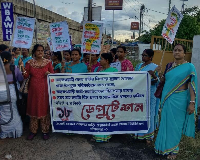 দু মাসের সবজি ও জ্বালানি বিল অবিলম্বে দেওয়া , কর্মী ও সহায়িকা নিয়োগ ,অনলাইন কাজ করার জন্য এ্যান্ড্রয়েড ফোন দেওয়া সহ ১১ দফা দাবি নিয়ে আজ পাঁশকুড়ার CDPO নিকট ডেপুটেশন ও মেচগ্রামে বিক্ষোভ মিছিল করে ওয়েস্ট বেঙ্গল অঙ্গনওয়াড়ী ওয়ার্কার্স এন্ড হেল্পারস ইউনিয়নের পাঁশকুড়া ব্লক কমিটি। নেতৃত্ব দেন সংগঠনের জেলা নেতৃত্ব আরতি সিং।
