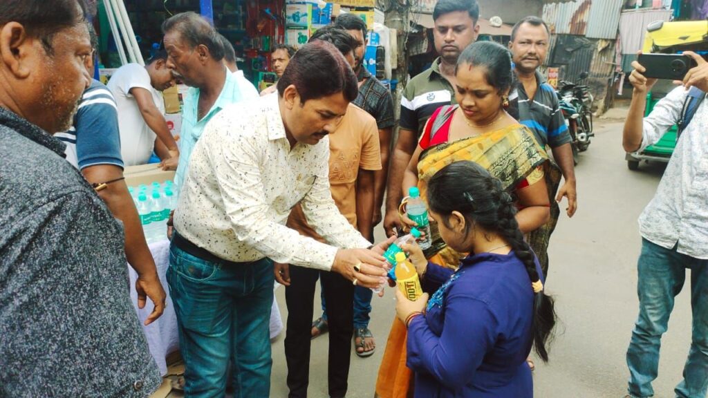 কাঁথির চৌরঙ্গী মোড়ে নিজের অফিসের সামনে রাজপথে দাঁড়িয়ে থেকে জল ও ফলের জুসের বোতল বিতরন করেন কাঁথি পৌরসভার ৪নং ওয়ার্ডের কাউন্সিলার আলেম আলি খান