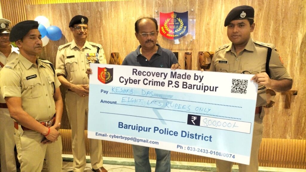 দীপক দাস বাড়ি গরিয়া এলাকায়। একটি বিদেশী কোম্পানি কাছে টাকা ফ্রড হয়েছিল ২২ লক্ষ টাকা দাস বাবু। প্রথমে তিনি লাল বাজারে সাইবার ক্রাইমে অভিযোগ জানান। লালবাজার থেকে তাকে বারইপুর পুলিশ জেলার বারুইপুরে বারুইপুরের সাইবার ক্রাইম দপ্তরে আসতে বলেছিলেন। নভেম্বর মাসে তার টাকা ফ্রড হয়েছিল তিনি মার্চ মাসে অভিযোগ জানিয়ে ছিলেন। তারপর বারুইপুর পুলিশ জেলা একে তার ৮ লক্ষ টাকা উদ্ধার করে। রবিবার সেই টাকা তুলে দেন বারইপুর পুলিশ জেলার পুলিশ সুপার পলাশ চন্দ্র ঢালি ।