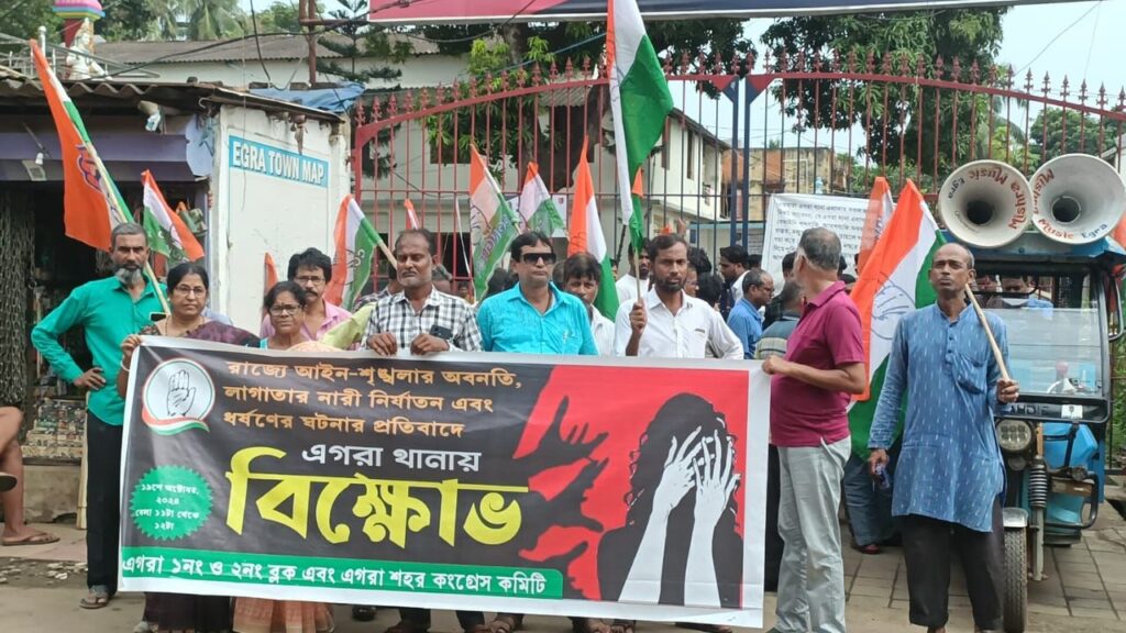রাজ্যে বেড়ে চলা নারী নির্যাতনের বিরুদ্ধে রাজ্য জুড়ে পথে নামলো জাতীয় কংগ্রেস। শনিবার সকাল ১১ টায় থেকে দুপুর ১২ টা অব্দি সারা রাজ্য জুড়ে নারী নির্যাতনের প্রতিবাদে মিছিল ও থানা ঘেরাও কর্মসূচী অনুষ্ঠিত হলো। এদিন পূর্ব মেদিনীপুর জেলার এগরা কংগ্রেসের কার্যালয়ের সামনে থেকে একটি মিছিল বার করা হয়। এই মিছিল এগরা শহর পরিক্রমা করে এগরা থানার সামনে এসে শেষ হয়। পুলিসি নিষ্ক্রিয়তার বিরুদ্ধে থানার সামনে ঘন্টা খানেক সময় ধরে বিক্ষোভ দেখান জাতীয় কংগ্রেসের কর্মীরা। পাশাপাশি কয়েক দফা দাবীতে কংগ্রেসের পক্ষ থেকে থানায় একটি ডেপুটেশনও দেওয়া হয় ।