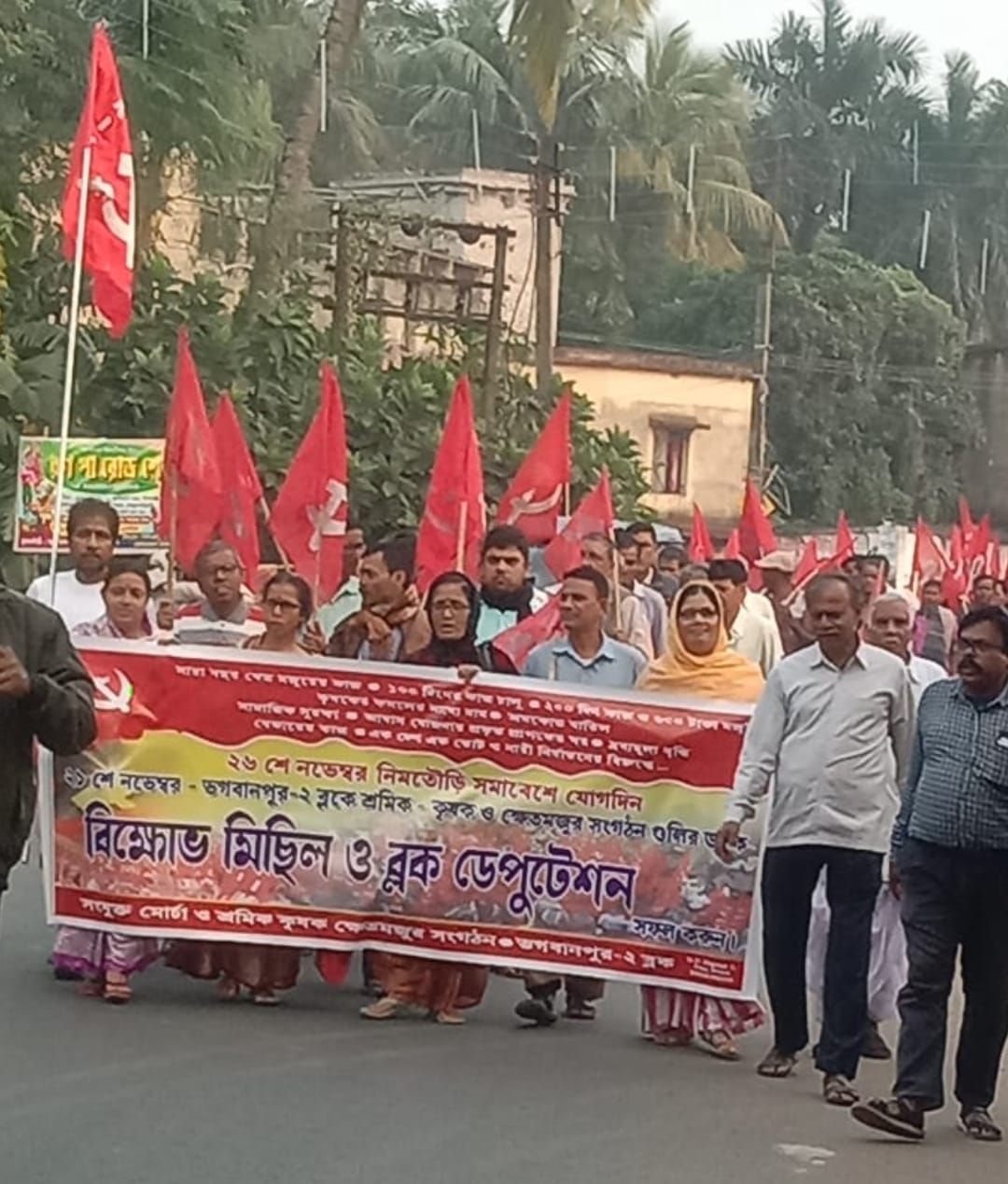 আজ ভগবানপুর-২ ব্লকে শ্রমিক, কৃষক, ক্ষেতমজুর সহ অন্যান্য গণসংগঠ গুলির পক্ষ থেকে বিক্ষোভ মিছিল ও ডেপুটেশান সংঘঠিত হয়। নেতৃত্ব দেন শ্রমিক নেতা কমরেড ভরত মাইতি, বিষ্ণুপদ মান্না, বাবুল মাইতি, ক্ষেতমজুর নেতা চিত্ত দাস, মেসবাউদ্দিন সাহা, রাখাল চন্দ্র জানা, নেতা অমলেন্দু দাশ, সত্য নারায়ণ নন্দ। উপস্থিত ছিলেন স্বরুপ খাটুয়া, শশাঙ্ক বর্মন, রামপদ সন্মিগ্রাহী, ইন্দুলেখা আচার্য, পূর্ণিমা মাইতি,তুষার পাল, তপন দাস, হরেশ মণ্ডল, চন্দন মাজি সহ অন্যান্য নেতৃত্বগণ। শ্রমিক, কৃষক, ক্ষেতমজুর সংগঠনের ৬ জন নেতৃত্ব বি ডি ওর কাছে ১৩ দফা দাবী সনদ নিয়ে আলোচনা করেন। মুগবেড়িয়া পার্টি অফিস থেকে কলেজ মোড় হয়ে মাধাখালী বাসস্ট্যান্ড ব্লক অফিসে প্রতিবাদী মিছিল পৌঁছায়। বিক্ষোভ সভায় নেতৃত্বগণ শ্রমিক, কৃষক, ক্ষেতমজুরের দাবী গুলি বক্তব্যের মধ্য দিয়ে তুলে ধরেন। বিক্ষোভ সভায় সভাপতিত্ব করেন শুকদেব জানা।