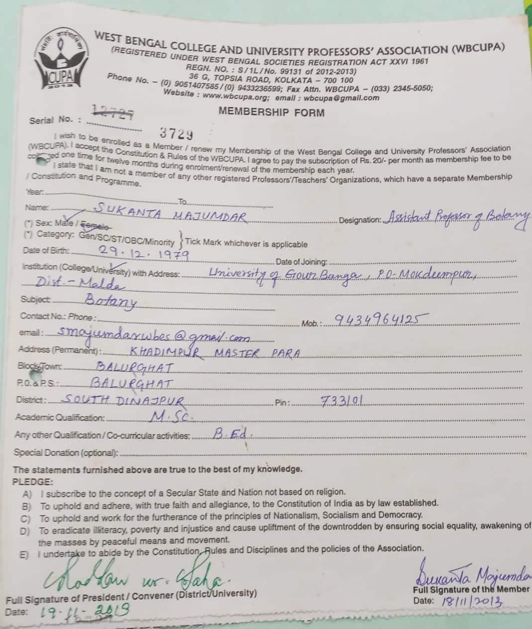 ওয়েবকুপা-য় সুকান্ত মজুমদারের সদস্যপদের ফর্ম৷