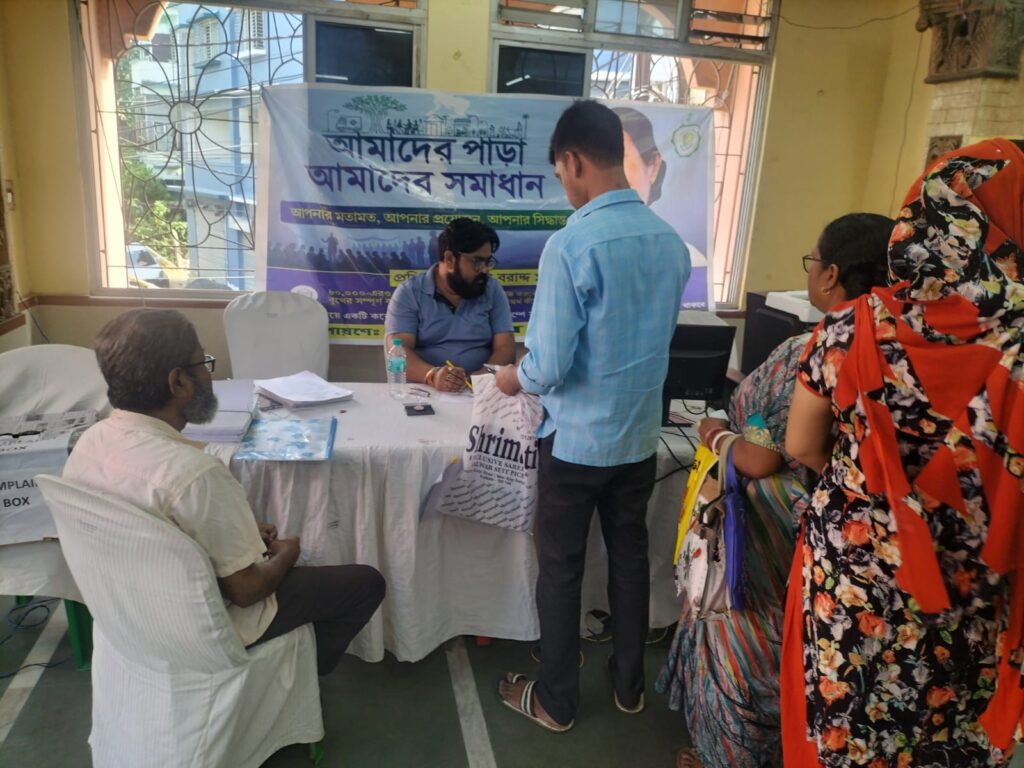 মুখ্যমন্ত্রী মমতা বন্দ্যোপাধ্যায় নতুন প্রকল্প আমাদের পাড়া আমাদের সমাধান সারা পশ্চিমবাংলায় এই প্রকল্পএর শিবির শুরু হয়েছে প্রকল্প আগস্ট মাস থেকে। এর মধ্যে দক্ষিণ ২৪ পরগনা জেলার বারুইপুরে বিভিন্ন গ্রাম পঞ্চায়েতে ও পৌরসভার ওয়ার্ডে বহু শিবির হয়েছে। সোমবার বারুইপুর পৌরসভার তিন নম্বর ওয়ার্ডে একটি কমপ্লেক্সে এই প্রকল্পের শিবির হয়। এই ওয়ার্ডের পৌর পিতা স্বপন মন্ডল বলেন আমাদের পাড়া আমাদের সমাধান শিবিরে ৭থেকে ৮টি অভিযোগ জমা পড়েছে। তারমধ্যে চার পাঁচটি ড্রেন নিয়ে অভিযোগ জমা পড়েছে আর দু তিনটে অভিযোগ জমা পড়েছে বারুইপুর রাসমনি বালিকা বিদ্যালয় এর সামনে রাস্তাটা নিয়ে।