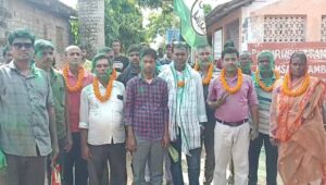 জয়ী পার্থিদের ফুলের মালা পরিয়ে শুভেচ্ছা জানান তৃণমূল নেতা প্রনব কর ও ফনিভুষন সীল।