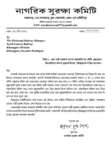 রেল যাত্রীদের সুরক্ষার্থে ট্রেনে ব্যাপক নজরদারি বাড়ানোর পাশাপাশি গতকালকে ভোগপুরে ধৌলি এক্সপ্রেসে মহিলার হার ছিনতাইয়ের ঘটনায় দুষ্কৃতকারীদের দৃষ্টান্তমূলক শাস্তির দাবী জানিয়ে আজ খড়্গপুরের ডি.আর.এম.কে স্মারকলিপি দেওয়া হয় নাগরিক সুরক্ষা কমিটির পক্ষ থেকে।