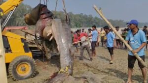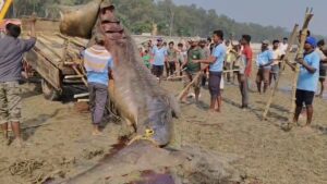 ওড়িষ্যার বালেশ্বর জেলার ভোগরাই ব্লকের তালসারী সমুদ্রতটে বুধবার গভীর রাতের উঠে আসে এক বিশাল হাঙ্গর—দৈর্ঘ্যে প্রায় ৩০ ফুট এবং ওজনে ৫০ কুইন্টালেরও বেশি! এমন দৈত্যাকার হাঙ্গর তালসারী অঞ্চলে এর আগে প্রায় দেখা যায়নি বলেই জানাচ্ছেন স্থানীয়রা।