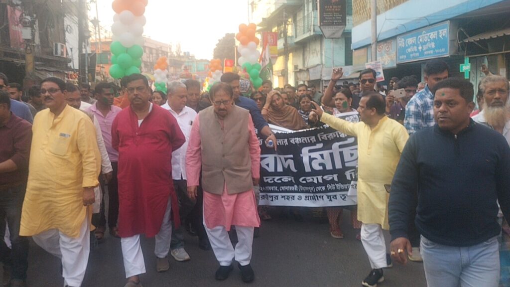 কেন্দ্রীয় সরকারের জনবিরোধী ও পশ্চিমবাংলা রাজ্যের প্রতি বঞ্চনার বাজেট ও এস আই আর এর নামে মানুষকে হেনস্তার বিরুদ্ধে বারুইপুর শহর যুব তৃণমূল কংগ্রেসের পক্ষ থেকে প্রতিবাদ ও ধিক্কারের জন্য মহা মিছিলের আয়োজন করেছে। মিছিলটি শুরু হবে বারুইপুর পৌরসভার ১২ নম্বর ওয়ার্ড সোনার তরী থেকে তা চলে বারুইপুর রবীন্দ্র ভবন পর্যন্ত। বারুইপুর শহর যুব তৃণমূল কংগ্রেসের পক্ষ থেকে এই মিছিলটি আয়োজন করা হয়।