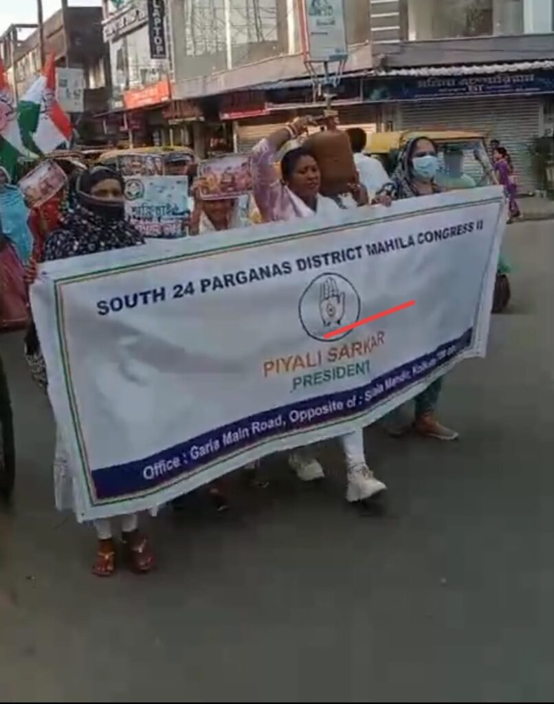 প্রদীপ কুমার সিংহ:  গ্যাসের দাম বৃদ্ধির ও গ্যাসের আকালের জন্য মানুষের সমস্যা জন্য দক্ষিণ ২৪ পরগনা জেলার ২মহিলা প্রদেশ কংগ্রেসের পক্ষ থেকে বারুইপুর বৃহস্পতিবার বিকেলে রান্নার সিলিন্ডার নিয়ে একটি মিছিল করে। এই মিছিলে উপস্থিত ছিলেন ৭০ থেকে ৮০ কংগ্রেসের মহিলা কর্মী। দক্ষিণ ২৪ পরগনা জেলা টু মহিলা কংগ্রেসের সভাপতি পিয়ালী সরকার বলেন কেন্দ্রে মোদি সরকার গ্যাসের দাম বারিয়ে দিয়েছে। তাতে করে সাধারণ মানুষের খুবই অসুবিধা হচ্ছে হোটেলগুলো বন্ধ হয়ে গেছে। মানুষের রান্নাঘরে গ্যাস না থাকায় রান্নাবান্না করতে খুবই অসুবিধা হচ্ছে। রাস্তার পাশে যে সব ছোট ছোট হোটেলগুলো ছিল তাও সব বন্ধ করে দিয়েছে। মানুষের সংসার চালানোর দায় হয়ে গেছে।