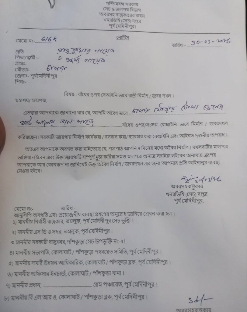 ওই গুরুত্বপূর্ণ নিকাশী খালের ভেতর ওই ব্যক্তি গত দুবছর আগে অস্থায়ী একটি কাঠামো তৈরি করেছিল। গত চারদিন পূর্বে ওই ব্যক্তি ঐ খুঁটি সরিয়ে ওই স্থানে কংক্রিটের কলম নির্মাণ করে আজ ছাদ ঢালাই করার কাজ শুরু করে। গত পরশুদিন সেচ দপ্তরের খন্যাডিহি সেকশনের আধিকারিকের পক্ষ থেকে ওই ব্যক্তিকে বেআইনি নির্মাণ বন্ধ রাখার নির্দেশ দেওয়া হলেও তা অমান্য করে আজও কাজ করে চলেছে। আজও দপ্তরের পক্ষ থেকে সকালে ওকে কাজ বন্ধ রাখার নির্দেশ দেয়। কিন্তু তাতেও কোন কাজ না হওয়ায় খন্যাডিহি সেকশনের আধিকারিকের পক্ষ থেকে ওনাকে আজ একটি নোটিশ দিয়ে কাজ বন্ধ রাখার নির্দেশ দেওয়া হয়েছে।