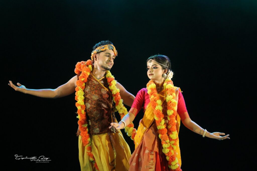 অনুষ্ঠানের প্রথম পর্বে উপস্থাপিত হয় বিভিন্ন নৃত্য ও সঙ্গীতনির্ভর পর্ব— ‘নৃত্যের তালে তালে’, ‘রবিরাগ’, ‘সাদ’, ‘মনে মনে’, ‘বসন্ত ছোঁয়া’ এবং ‘মুক্তি’। প্রতিটি পরিবেশনাই রবীন্দ্রনাথের ভাবনা ও দর্শনের সূক্ষ্ম ব্যাখ্যা তুলে ধরে। বিশেষ আকর্ষণ ছিল একটি দলগত নৃত্য পরিবেশনা, যেখানে রবীন্দ্রসঙ্গীতের সঙ্গে কাথক নৃত্যের বোলের অপূর্ব মেলবন্ধন সৃষ্টি করে এক অনন্য ছন্দময় সংলাপ।